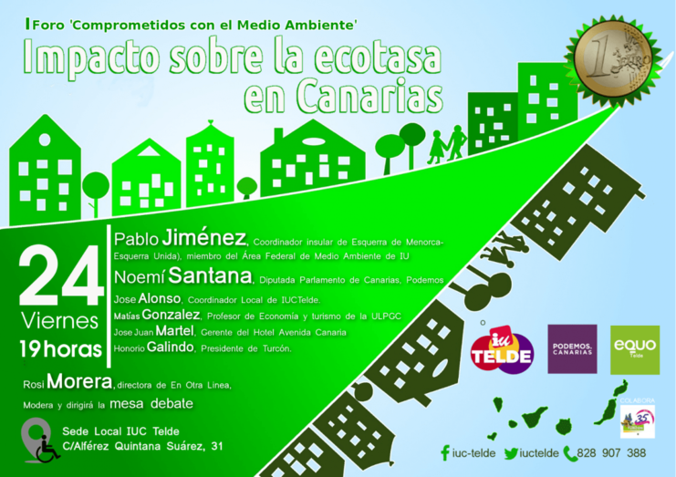 Telde.- Los partidos políticos Izquierda Unida Canaria, Podemos y Equo celebrarán este viernes en la ciudad de Telde un foro medioambiental que reunirá a políticos y expertos para analizar el impacto que la ecotasa, una impuesto verde que gravaría aquellas energías e industrias contaminantes con el medioambiente, tendría sobre el Archipiélago, en donde su implantación ya ha sido recachazadaa en varias ocasiones por el Ejecutivo regional.
