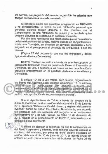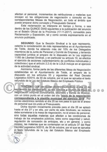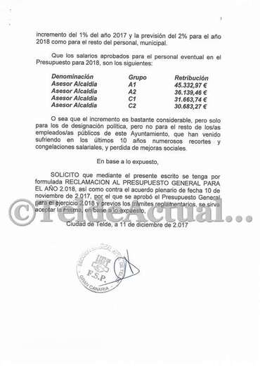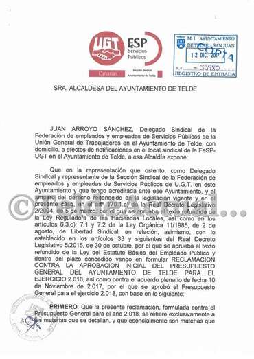 Telde.- La sección sindical de UGT en el Ayuntamiento de Telde ha presentado una reclamación contra el presupuesto municipal para 2018 al entender que contempla un incremento de las retribuciones para cargos públicos y personal de confianza respecto a lo fijado al inicio del mandato.