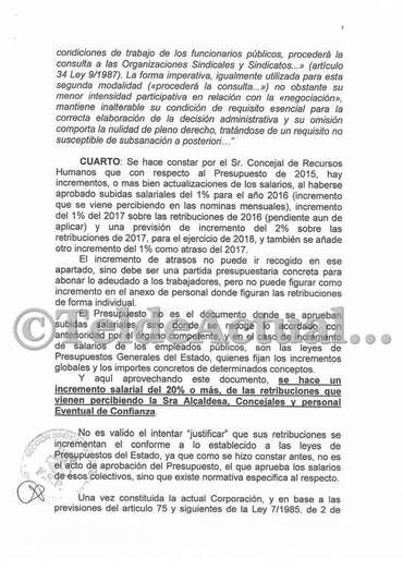 Según el sindicato, este incremento se debe a que los sueldos de políticos y asesores se ha basado en las asignaciones que figuraban en el presupuesto de 2015, que se prorrogó en las anualidades de 2016 y 2017, cuando entiende que las cantidades que deben tomarse como referencia son las que se aprobaron al inicio del actual mandato en la sesión plenaria de 26 de junio de 2015 en la que se determinó la aplicación de una reducción del 20% de los sueldos fijados para la Alcaldía, concejales del Gobierno y de la oposición y cargos eventuales.