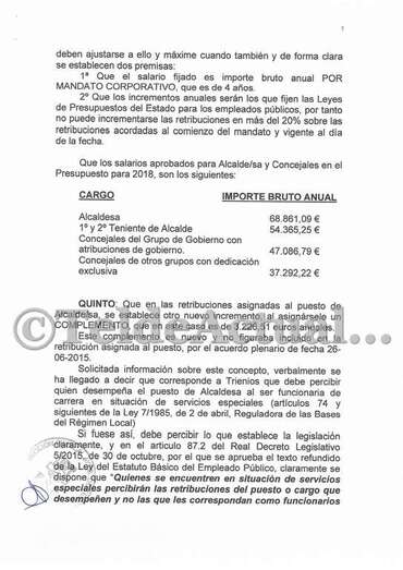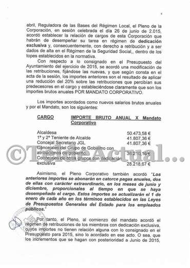 "Me centro ahora en los salarios de la corporación. El 26 de junio de 2015 tuvo lugar el primer pleno tras la constitución de la actual corporación. En dicho pleno se aprobaron, entre otras cosas, los salarios brutos anuales de los miembros del gobierno y liberados de la oposición, siendo: