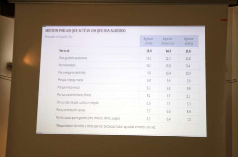 Se proyectan cuadros estadísticos de estudios que recogen el aumento en un porcentaje muy elevado de acoso escolar registrados en 2014 al 2016, con la cifra de un 240% de incremento de casos con respecto a los anteriores y motivos por los que actúan los que han agredido, desde gastar bromas, manías hacía la persona acosada, características físicas, orientación sexual, color de piel, cultura o religión, por cosas que gustan, etc.