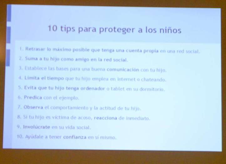 Con respecto a una de las puntualizaciones más importantes de la ponencia es el concienciar a los padres y a la comunidad educativa de la importancia de formar en valores a este gran colectivo menor de edad, y al mismo tiempo ofrecer las herramientas necesarias para detectar a tiempo en los menores toda forma de violencia, en las aulas o fuera de ellas, por lo que en las diferentes proyecciones que ayudan a entender las causas, consecuencias, se ofrecen soluciones de protección a los menores desde la actuación de los padres, como: Retrasar lo máximo posible que tenga una cuenta propia en una red social. Establecer las bases para una buena comunicación con el hijo, sumándole como amigo en la red social. Limitarles el tiempo que emplea en Internet o chateando. Evitar que tenga ordenador o Tablet en su dormitorio. Predicar con el ejemplo. Observar la actitud y comportamiento con el hijo. Si el hijo es víctima de acoso, reaccionar de inmediato. Involucrarse en su vida social, ayudarle a tener confianza en sí mismo.