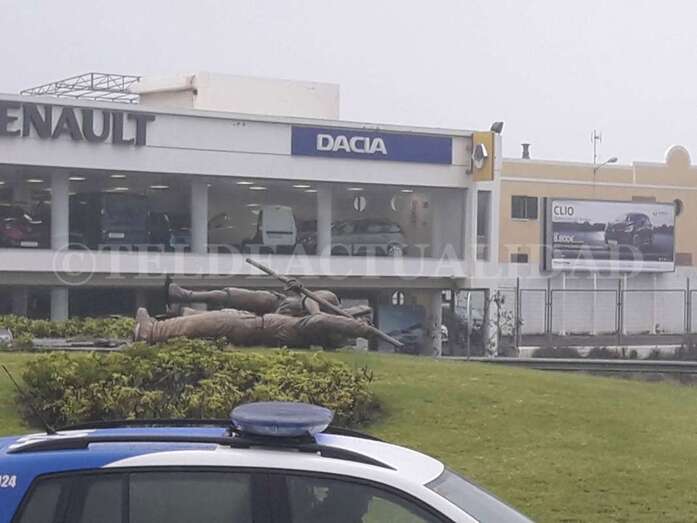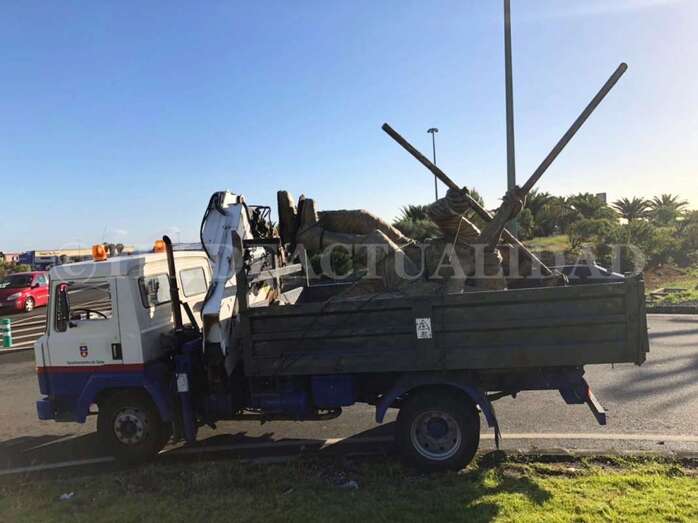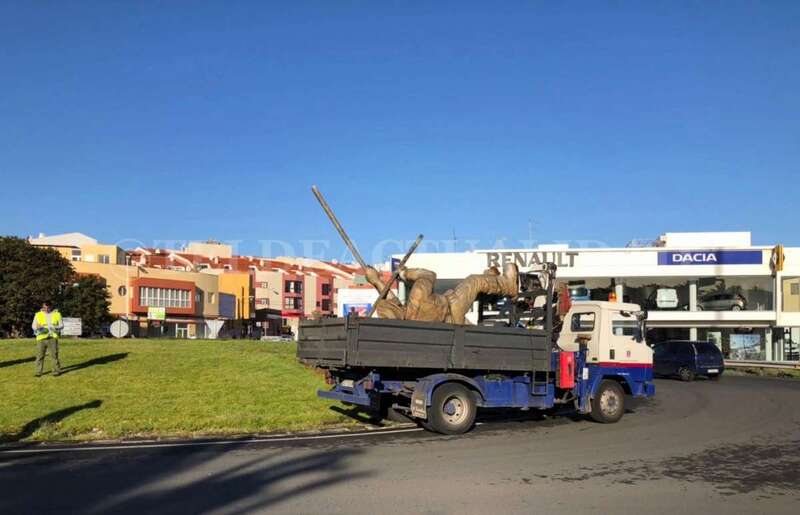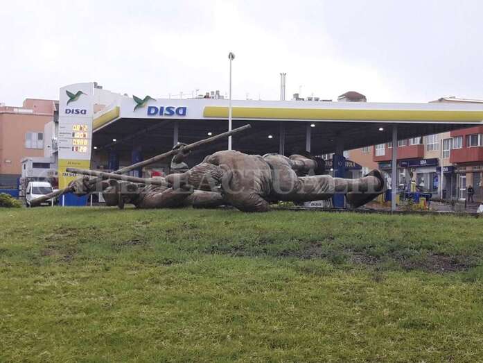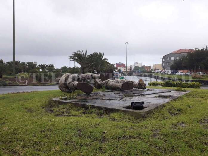 Telde.- Las fuertes rachas de viento que han soplado en Telde durante los últimos fenómenos meteorológicos adversos han derribado varias de las esculturas que adornan sus rotondas. En concreto tres. La última ayer mismo, cuando a media tarde se venía abajo el conjunto figurativo del Juego del Palo que coronaba la glorieta del Cruce de Melenara.
