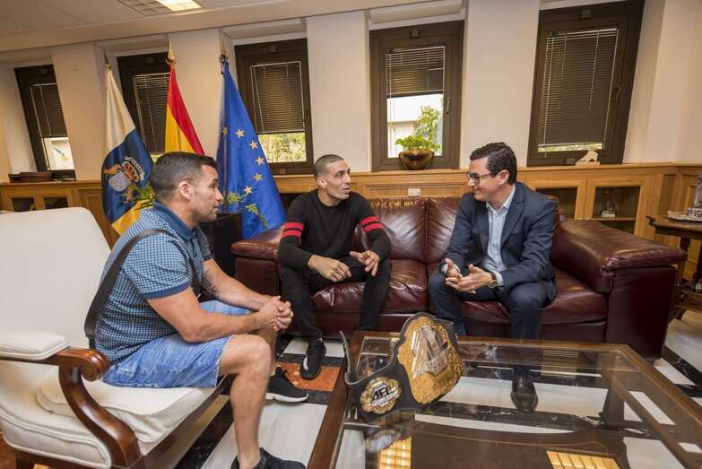 Telde.- El vicepresidente y consejero de Obras Públicas y Transportes del Gobierno de Canarias, Pablo Rodríguez, recibió este viernes al luchador grancanario que se proclamó el pasado sábado, y por segundo año consecutivo, campeón del mundo de artes marciales mixtas, en la categoría de peso wélter, Juanma Suárez.