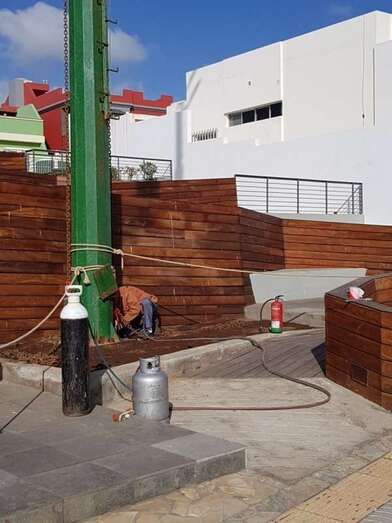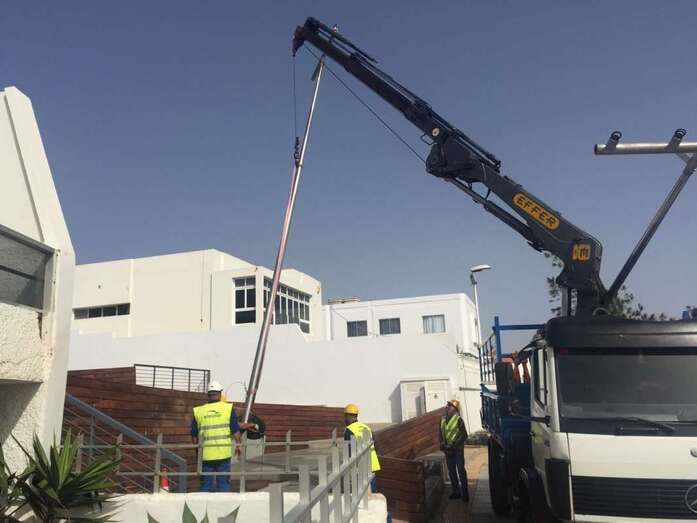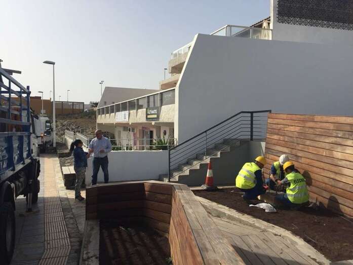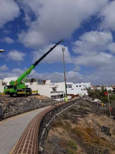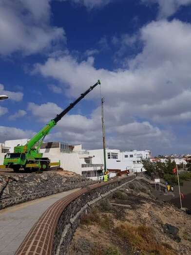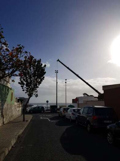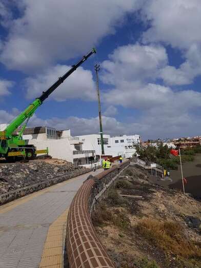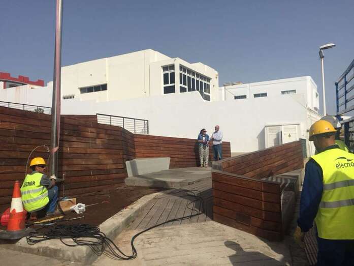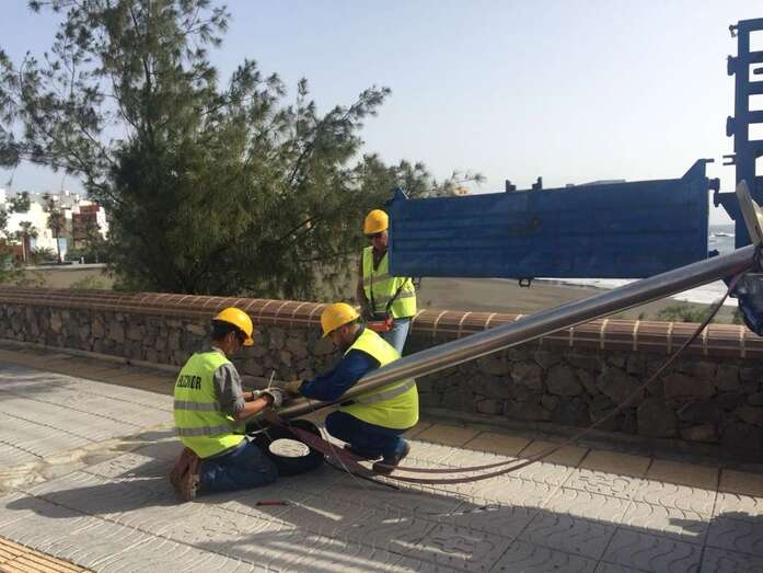 Agustín Arencibia (NC), edil del área, explica en una nota de prensa que la pasada semana, con ayuda de una grúa de gran tonelaje, se retiraron los antiguos báculos de acero galvanizado situadas en los dos extremos de la cala y que alumbraban parte de la avenida y la arena.