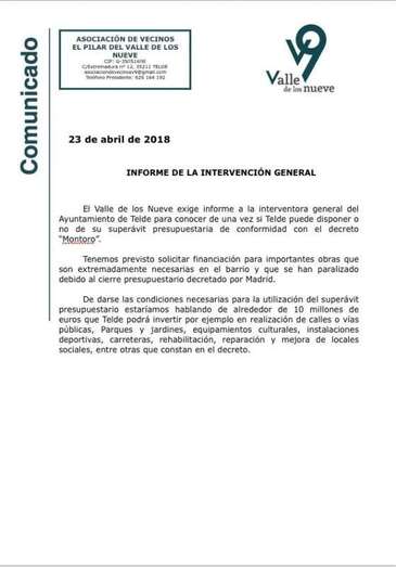 Telde.- La Asociación de Vecinos El Pilar del Valle de los Nueve ha solicitado un informe a la Intervención del Ayuntamiento de Telde sobre el superávit que el Consistorio podrá utilizar, en disposición de la autorización del Ministerio de Hacienda y Administraciones Públicas del Gobierno de España.