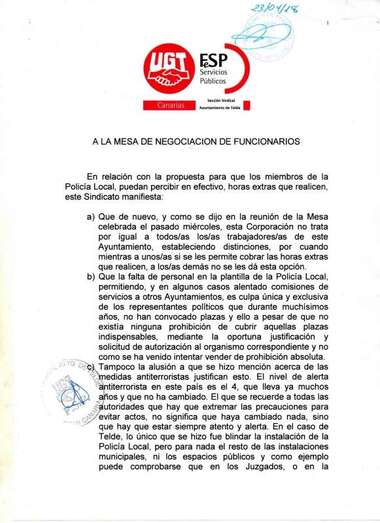 Telde.- UGT no apoyará hoy la propuesta del gobierno municipal de recuperar el pago de las horas extra a la Policía Local y destinar a ese fin 162.000 euros durante 2018 al entender que la medida no está justificada y menos cuando resulta «arbitraria y discriminatoria» para con el resto del personal del Ayuntamiento, que seguirá sujeto al acuerdo plenario de 2009 que impedía pagarlas.