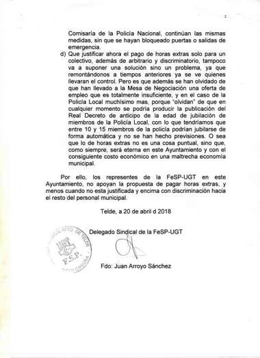 Se queja UGT de que la Corporación no trata por igual a sus trabajadores, advierte de que la falta de personal en la Policía Local es culpa de los representantes políticos, niega que la alerta antiterrorista 4 que hay en España justifique el pago de las horas extra porque esa declaración data de años, y subraya que esta medida «no será una solución, sino un problema», porque tenderá a eternizarse en lugar de convocar nuevas plazas de policía. Ven insuficientes las 21 previstas para 2018.