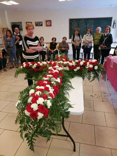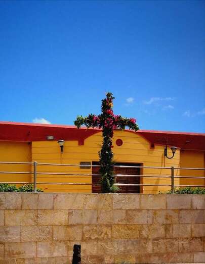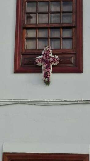 Una gran cruz realizada con flores preside desde anoche la fachada principal del local social del colectivo El Roque Azucarero.
