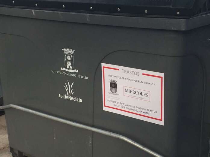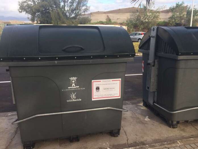 Telde.- La Concejalía de Limpieza Viaria ha colocado pegatinas informativas en los contenedores del Distrito Costa para facilitar a las personas que residen en esta zona del municipio las fechas y horario del servicio de de recogida de enseres con el fin de evitar que los trastos permanezcan en la vía pública durante días.