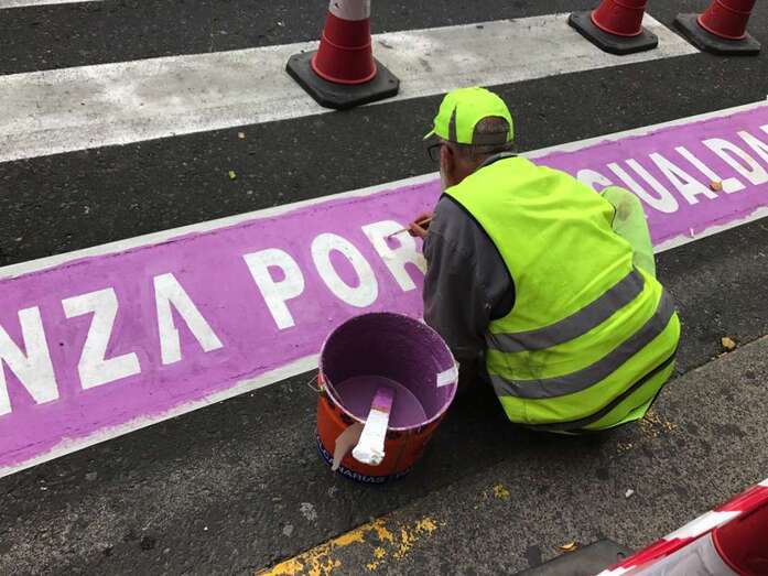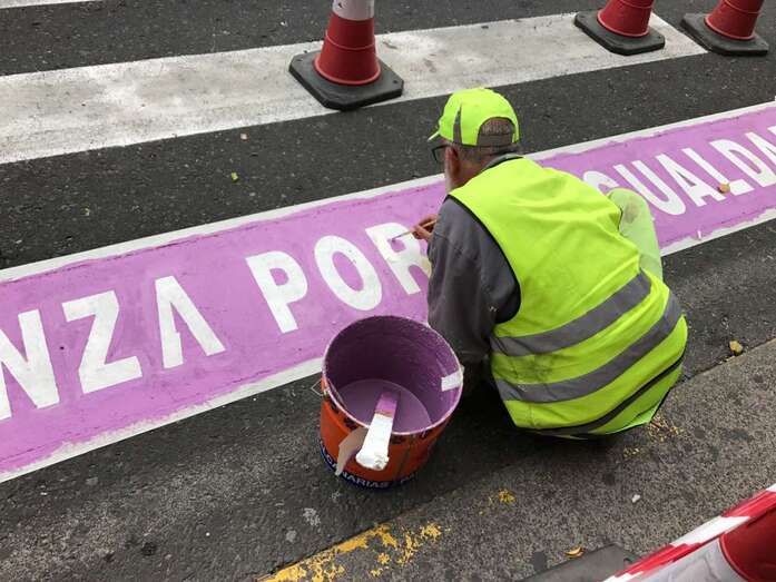 Telde.- La Concejalía de Tráfico del Ayuntamiento de Telde ha procedido este miércoles a repintar de color lila el paso de peatones de la calle Poeta Pablo Neruda sobre el que este año, con motivo de la celebración del Día Internacional de la Mujer, se estamparon lemas igualitarios.