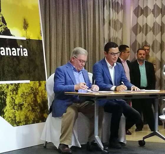 Pablo Rodríguez, secretario general de CC de Gran Canaria, y José Miguel Bravo de Laguna, suscribieron el acuerdo preelectoral en un acto celebrado en la capital grancanaria con el arropamiento de decenas de militantes de ambas formaciones políticas.