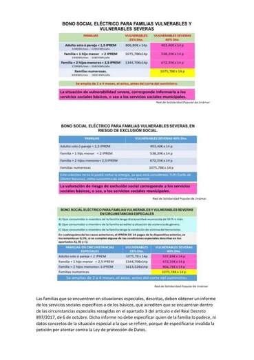 La realidad que nos encontramos las personas organizadas en la RSP, que han tenido que ir a pedir informes sobre la situacion de vulnerabilidad severa y sobre las que están en condiciones especiales, es que en la mayoría de los casos los trabajadores sociales les niegan los informes diciéndoles que ellos no tiene instrucciones para esto o que no les compete realizar los informes sobre la situación de vulnerabilidad, a los que tienen derecho. En los pocos casos de informes emitidos por discapacidades, no se adaptan a la Ley, porque detallan datos personales y específicos de la discapacidad del solicitante del bono social, y son rechazados por las eléctricas al atentar contra la protección de datos del usuario. Esta última situación y las anteriores denota que los trabajadores sociales desconocen los detalles del R.D. 897/2017 y aunque elaboran dichos informes, no hacen bien su trabajo por desconocimiento de los detalles de la norma.