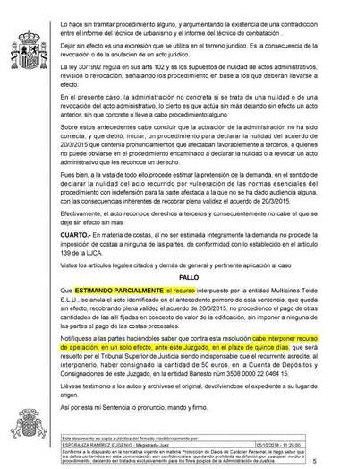 La jueza ha anulado el acuerdo de la Junta de Gobierno Local del 26 de marzo de 2015 porque sencillamente se adoptó sin aplicar los procedimientos que para casos así fija la ley. «Debió declararse la lesividad del acuerdo y eso requería, entre otras cosas, solicitar un informe preceptivo al Consejo Consultivo y, por supuesto, dar un trámite de audiencia a la otra parte, por lo que ya contábamos con que esto estaba perdido», explicó ayer la regidora municipal.