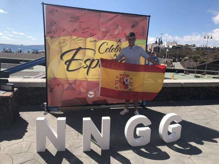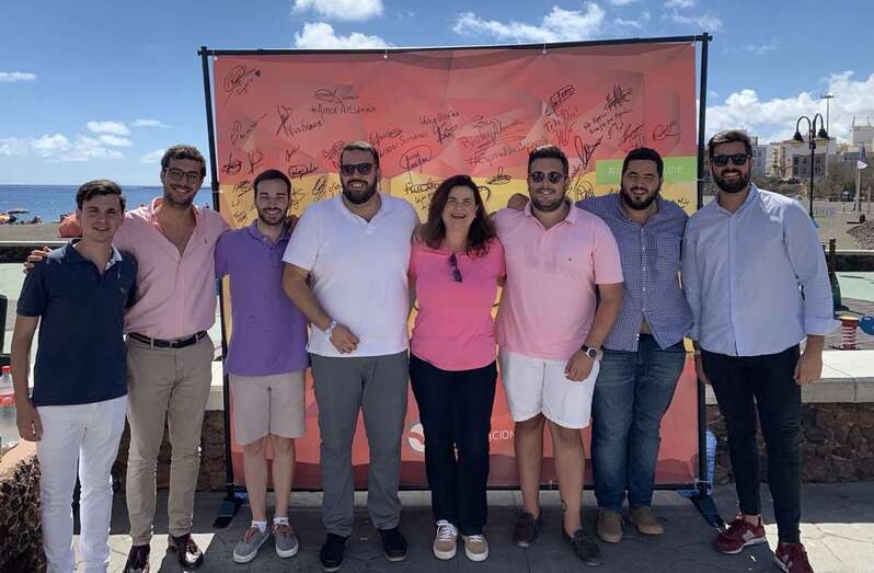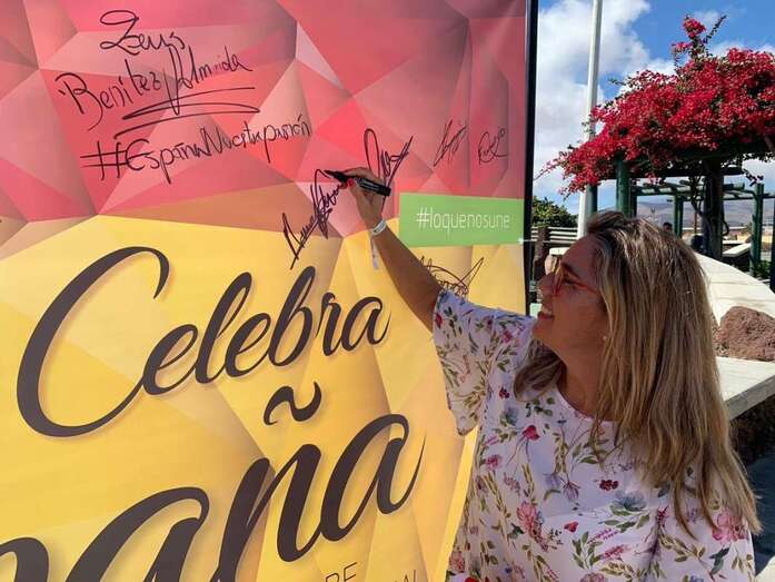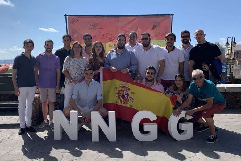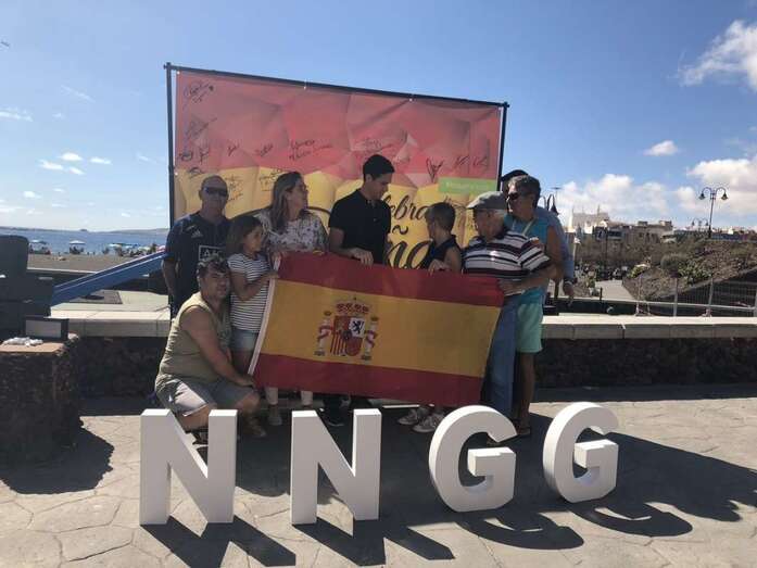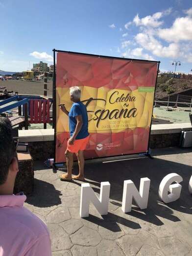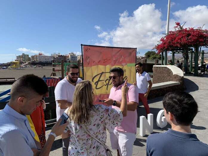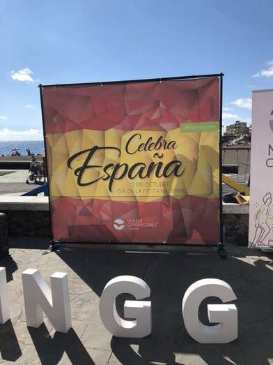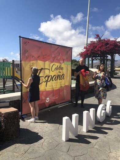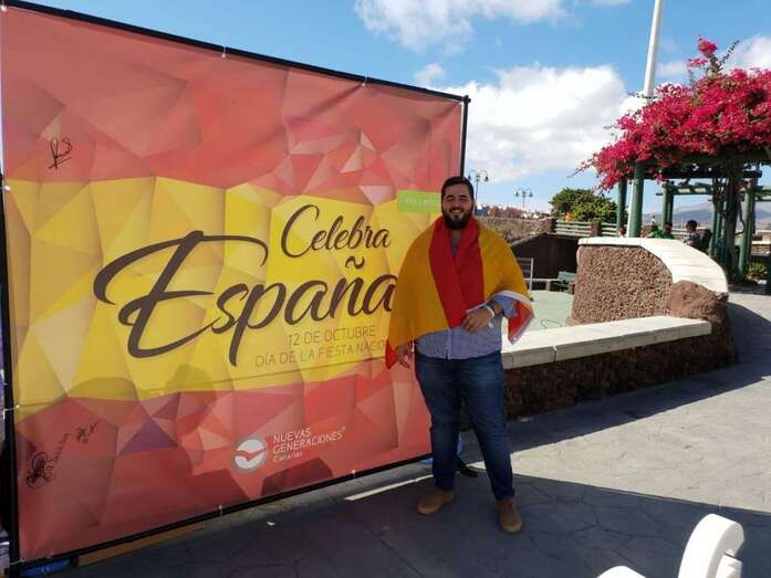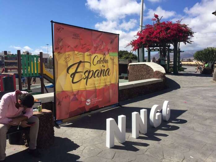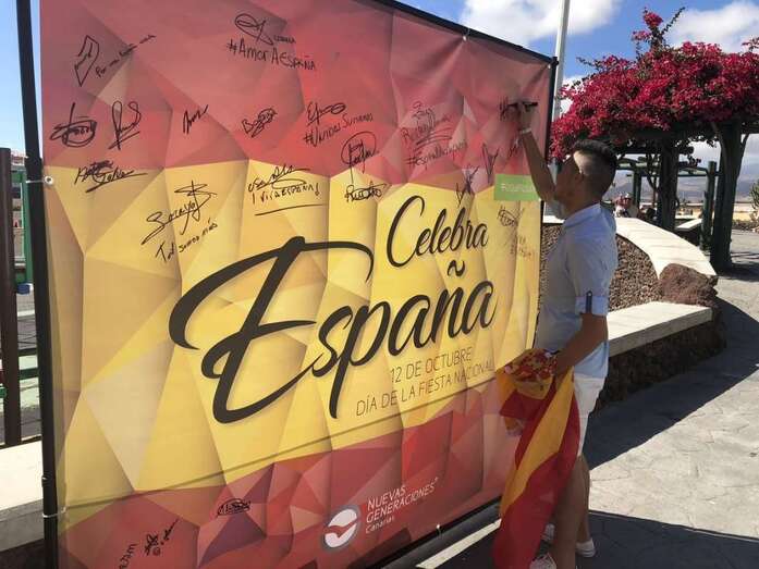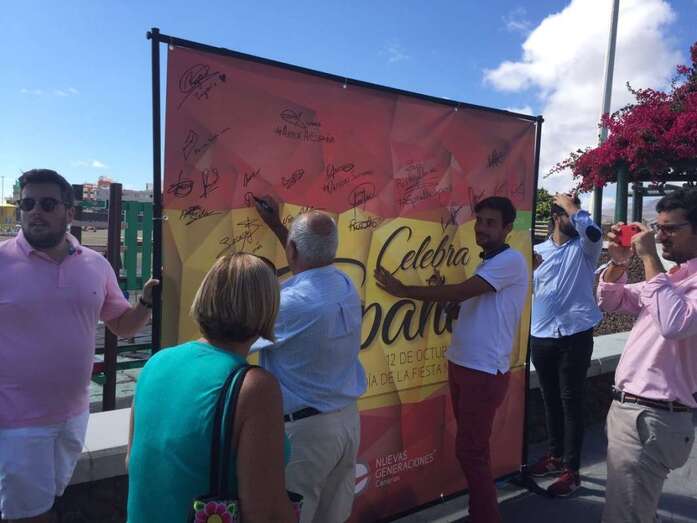 Bajo el lema Celebra España, Día de la Fiesta Nacional, la cantera de los populares canarios se reunió al mediodía en el paseo marítimo de esta cala teldense e instaló un desplegable con la enseña roja y amarilla en el que invitaron a firmar y posar a los simpatizantes y ciudadanos que por allí pasaban y que quisieran secundar esta iniciativa.