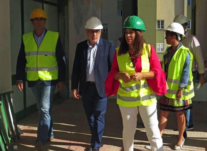 La alcaldesa, Carmen Hernández, la delegada del Gobierno en Canarias, Elena Máñez, el viceconsejero de Políticas Sociales y Vivienda, Francisco Candil, el presidente del Cabildo grancanario, Antonio Morales, la consejera de Vivienda insular, Minerva Alonso, el director del Consorcio de Vivienda del Cabildo, Alejandro Parres, la subdelegada del Gobierno Teresa Mayans, y los concejales Celeste López, Gloria Cabrera, Diego Ojeda y Abraham Santana, recorrieron el edificio de La Gerencia –en proceso de rehabilitación-, el Centro de la Infancia, los edificios que han sido rehabilitados y los trabajos que se están realizando en las calles Manuel Alemán Álamo e Ídolo de Jinámar.