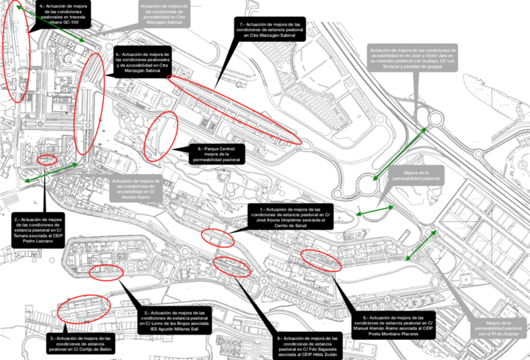 Por lo pronto, se trata solo de propuestas que deben ser luego concretadas con los colectivos y agentes sociales de Jinámar. Pero ya se dibujan diez de estas nuevas plazas urbanas junto a equipamientos educativos, sanitarios, cívicos y deportivos: En el centro de salud de la calle José Arjona Umpiérrez, en la calle Támara junto colegio Pedro Lezcano, en Cortijo de Belén, en la carretera general desde la plaza hasta la aproximadamente la calle Barcelona (justo el tramo que se corta para las fiestas), en el Lomo de Las Brujas junto al IES Agustín Millares Sall, en la calle Manuel Alemán Álamo a la salida del colegio Montiano Placeres, en la calle Fernando Sagaseta a la altura del colegio Hilda Zudán, en los accesos al Parque de las Mil Palmeras y en la carretera de Marzagán.