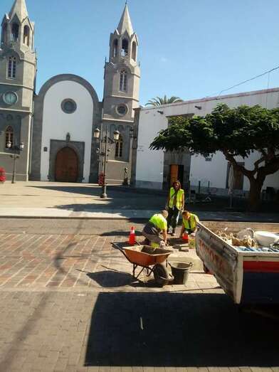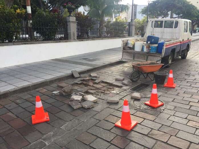 Telde.- Operarios de la Concejalía de Vías y Obras del Ayuntamiento de Telde procedieron este jueves a reponer las piezas estropeadas del adoquinado de la vía principal de San Juan, en el tramo que va desde la esquina con la calle de Conde de la Vega Grande hasta la intersección con la de Pérez Camacho.