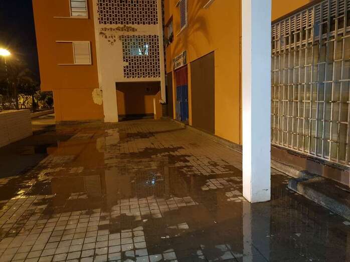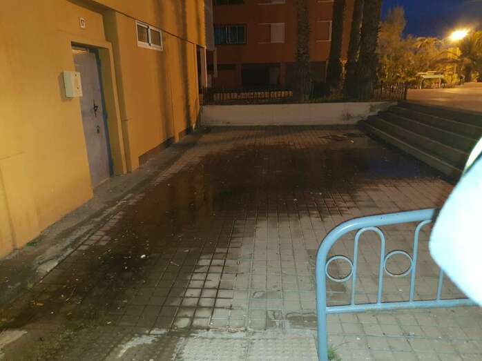 Aguas de Telde ha aclarado que el derrame tiene su origen en el local número 22, próximo a la farmacia de este complejo residencial de viviendas de promoción pública.