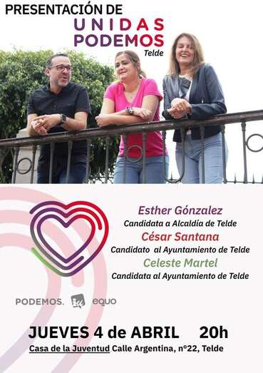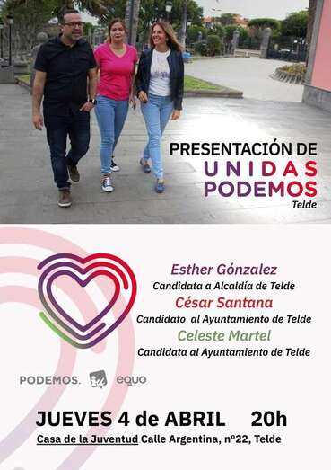 El acto político de Unidas Podemos, IUC y Equo ha sido anunciado para las 20.00 horas y en él intervendrán la actual concejala de la oposición y candidata a la Alcaldía de Telde, Esther González, y César Santana (IUC) y Celeste Martel (Equo), miembros de la lista electoral.