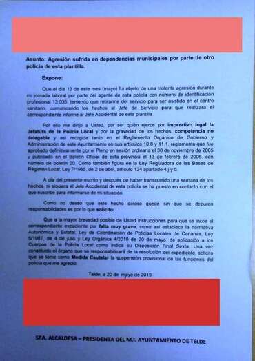 Indica el denunciante en el escrito al que ha tenido acceso TELDEACTUALIDAD que puso lo sucedido en conocimiento de la jefatura accidental del cuerpo de seguridad municipal y que desde entonces nadie se ha puesto en contacto con él para “informarse de mi situación”.