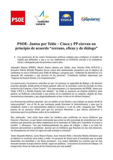 En un comunicado remitido a TELDEACTUALIDAD a las 16.11 horas, hace apenas un minuto,  por Juan Antonio Peña, líder de Ciuca, las cuatro fuerzas dan fe pública del principio de acuerdo "cercano, eficaz y de diálogo" que llevará al socialista Alejandro Ramos a la Alcaldía del municipio y que situará al nacionalista Héctor Suárez como vicealcalde.