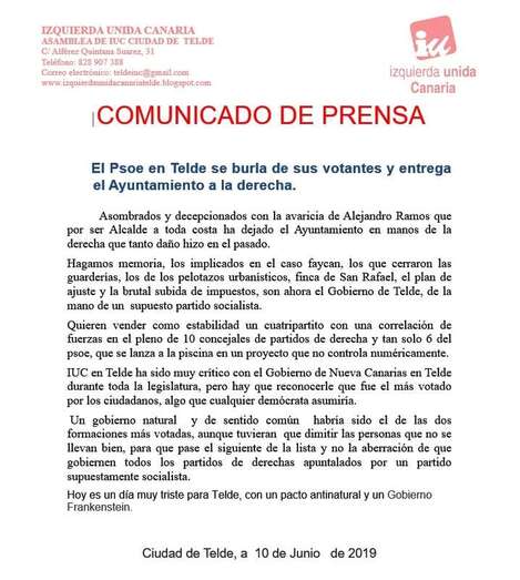 Telde.- Izquierda Unida de Telde califica de “pacto antinatura y Gobierno Frankestein” el acuerdo alcanzado por el PSOE con CC, Ciuca y PP para el Gobierno del municipio. En un duro comunicado, que TELDEACTUALIDAD avanza a sus lectores, IU acusa a los socialista de “burlarse de sus votantes y de entregar el Ayuntamiento a la derecha” y muestra su decepción con la “avaricia de Alejandro Ramos para ser alcalde”.