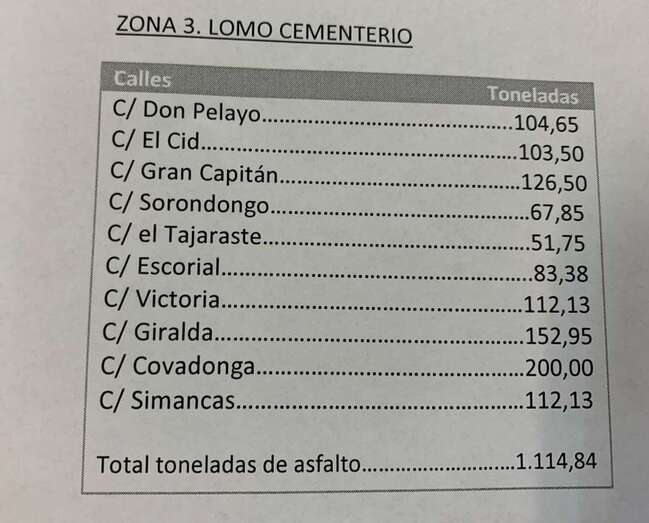 Por su parte, en las vías de Pelayo, El Cid, Gran Capitán, Sorondongo, El Tarajaste, Escorial, Victoria, Giralda, Covadonda y Simancas, ubicadas en el sector de Lomo de Cementerio que da al naciente, Vías y Obras gastará 1.114,84 toneladas de asfalto.