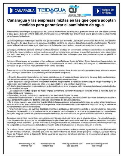 La compañía, participada al 50% por el Ayuntamiento de Telde y Canaragua, anuncia en un comunicado del grupo empresarial al que pertenece que todas ellas han adoptado las “decisiones necesarias” para disponer, “en tiempo y plazo”, del material preciso para asegurar la calidad del suministro “con todas las garantías que habitualmente vienen siendo aplicadas”.