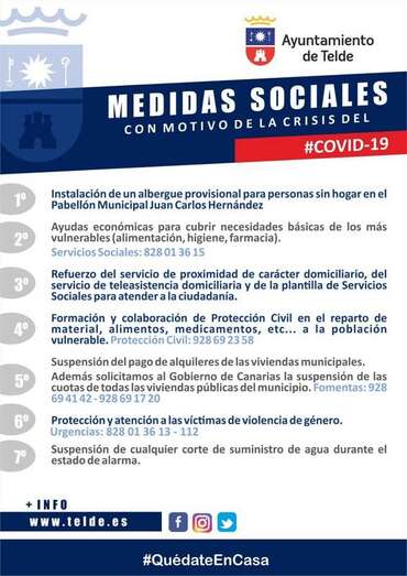 Telde.- Telde ya trabaja en un Plan municipal para la reactivación de la economía tras la crisis del coronavirus. El Ayuntamiento ha puesto en marcha un paquete de medidas que contempla más ayudas sociales a la ciudadanía y recursos humanos para gestionarlas. Además se modifica el calendario fiscal para aplazar el pago de impuestos municipales, se suspende el alquiler de viviendas municipales y se garantiza el suministro de agua a toda la població.