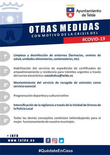 La protección animal, la intensificación de los servicios de vigilancia a través de la Policia Local de Telde, la habilitación de servicios especiales de expedición de certificados para trámites que conlleven urgencia y la programación continuada en materia de deporte y cultura, fundamental para salud de la ciudadanía en estos momentos, completan el amplio paquete de medidas impulsados por el Gobierno para hacer frente a esta urgencia sanitaria y social.