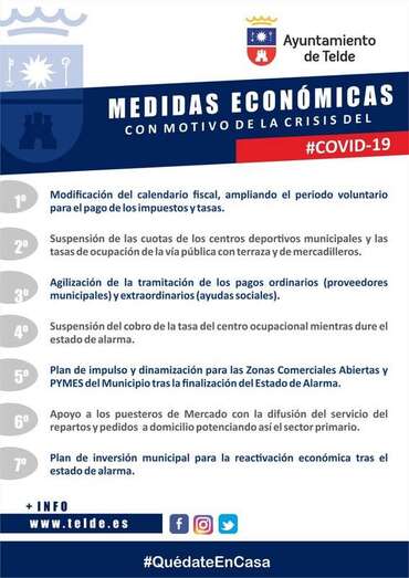 En materia económica, el Ayuntamiento de Telde ha desarrollado una modificación del calendario fiscal que contempla la ampliación del periodo voluntario para el pago de impuestos y tasas; la agilización en la tramitación de los pagos a provedores muicipales y de las ayudas sociales; la suspensión de las cuotas en centros deportivos y de las tasas de ocupación de la vía pública con terrazas además de la que deben pagar los mercadilleros, en un claro esfuerzo por facilitar que puedan continuar desarrollando su labor de servicio esencial con más facilidades.