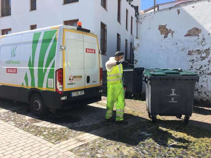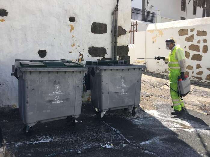 Uno de los aspectos más esenciales de la batalla que se mantiene contra el virus radica en extremar la limpieza en todo el municipio. De ahí que los operarios y operarias de la Concejalía de Limpieza continúen actuando a diario, con dobles turnos, baldeando, desinfectado y limpiando contenedores y otros elementos, en las calles de los barrios de Telde.