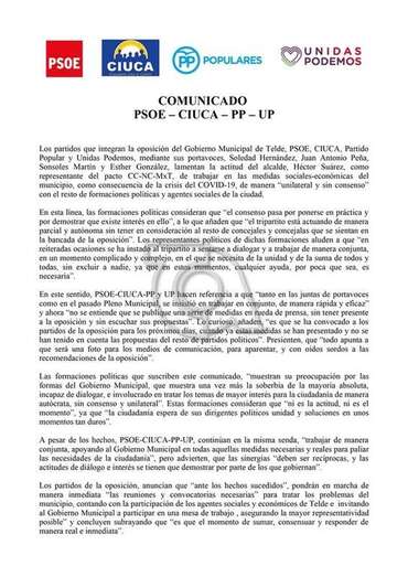 Los partidos que integran la oposición del Gobierno Municipal de Telde, PSOE, CIUCA, Partido Popular y Unidas Podemos, mediante sus portavoces, Soledad Hernández, Juan Antonio Peña, Sonsoles Martín y Esther González, lamentan la actitud del alcalde, Héctor Suárez, como representante del pacto CC-NC-MxT, de trabajar en las medidas sociales-económicas del municipio, como consecuencia de la crisis del COVID-19, de manera “unilateral y sin consenso” con el resto de formaciones políticas y agentes sociales de la ciudad.