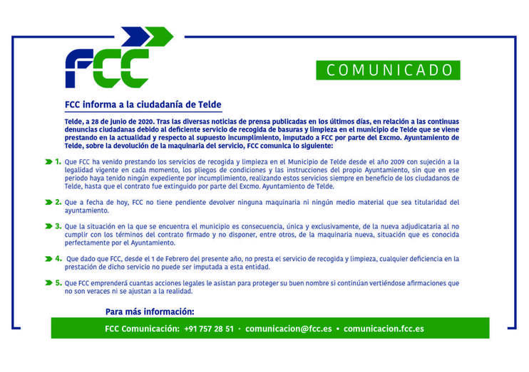 Tras las diversas noticias de prensa publicadas en los últimos días, en relación a las continuas denuncias ciudadanas debido al deficiente servicio de recogida de basuras y limpieza en el municipio de Telde que se viene prestando en la actualidad y respecto al supuesto incumplimiento, imputado a FCC por parte del Excmo. Ayuntamiento de Telde, sobre la devolución de la maquinaria del servicio, FCC comunica lo siguiente: