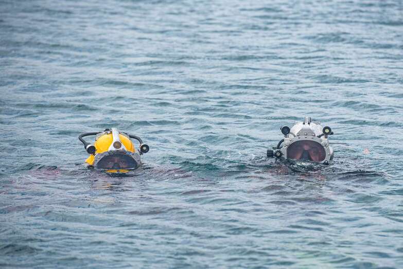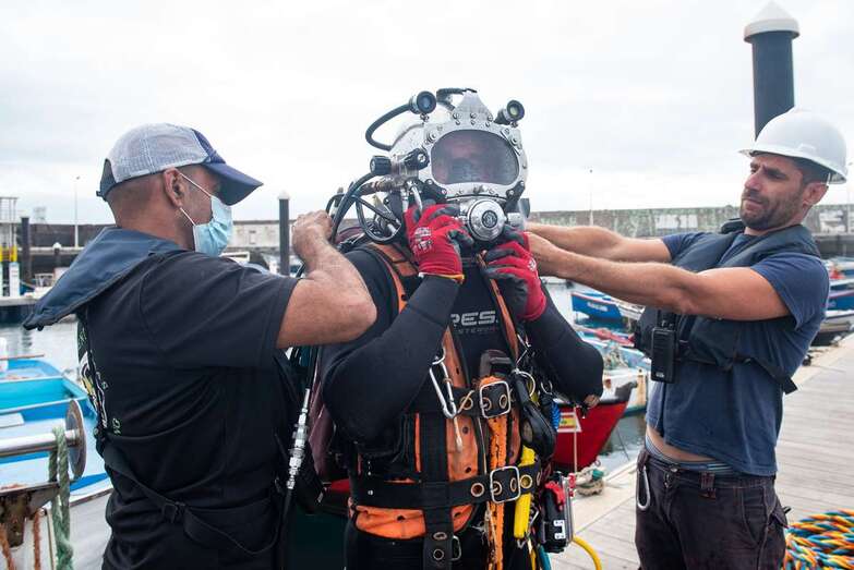 Dos buzos con el refuerzo de otros dos profesionales en tierra, un jefe técnico y el vehículo de apoyo dotado con pantalla para seguir al segundo la evolución de los trabajos bajo el mar completaron durante la mañana la colocación de 7 nuevos bloques de hormigón de casi 3 toneladas cada uno para afianzar las 5 hileras de cadenas, de 75 metros de largo cada una.