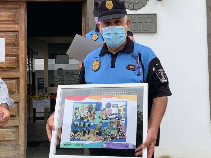 La concejala del área, Auri Saavedra, entregó este martes a los agentes de la Policía Local, a través de su jefe accidental, José Luis Ramos, una lámina creada por el diseñador gráfico y humorista Morgan en la que se recoge el día a día de la labor de este cuerpo de seguridad. En el acto participaron también el concejal de Seguridad, Agustín Arencibia, el miembro fundador de la plataforma ciudadana Aprendiendo a Cuidar, Violenciacero, Arturo Boyra, y dos agentes policiales, en representación de sus compañeros y compañeras.