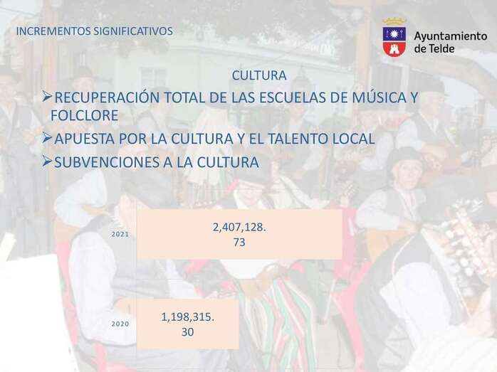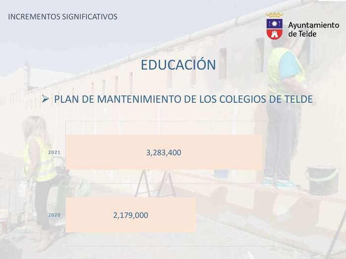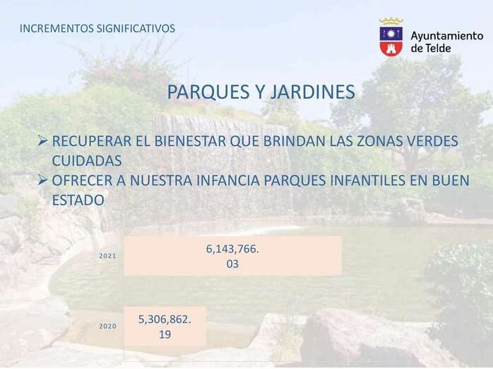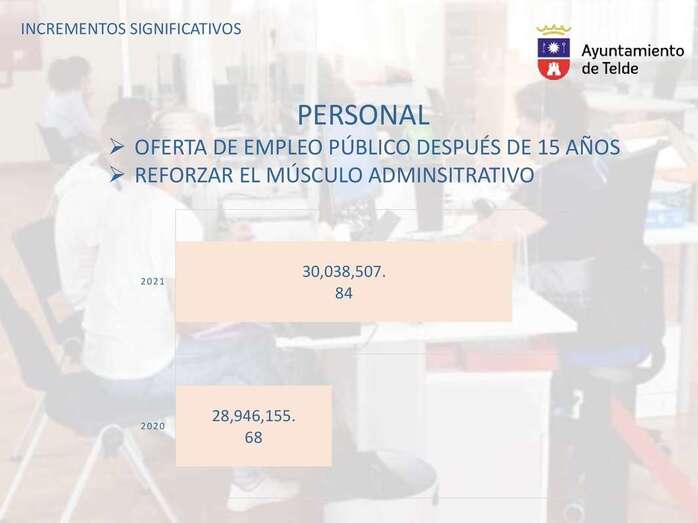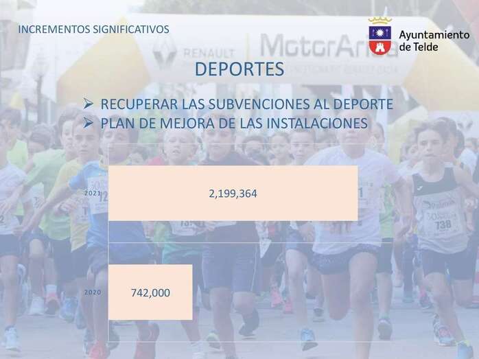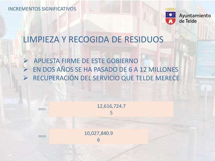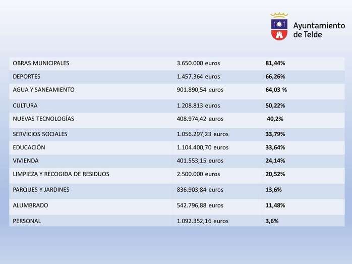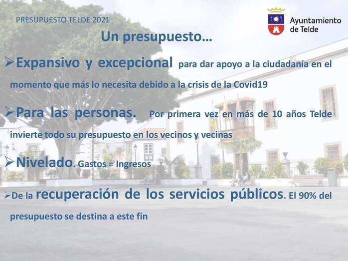 La ciudad de Telde deja atrás una década "muy dura" y "oscura", marcada por una economía casi de guerra y con importantes restricciones en el gasto y recortes en los servicios públicos, e iniciará en 2021 una nueva etapa con el contador de la deuda bancaria a cero, después de haber logrado liquidar un pasivo que en 2015 se cuantificaba en nada más y nada menos que 154 millones de euros. Y lo hará con un presupuesto de 94.184.130,31 euros (frente a los 84.391.555,99 euros del anterior) en el que se incrementan considerablemente tres capítulos: el gasto social para hacer frente a la crisis socioeconómica de la covid-19, los fondos para reforzar unos servicios municipales mermados a lo largo de los últimos años y la inversión en obra pública.