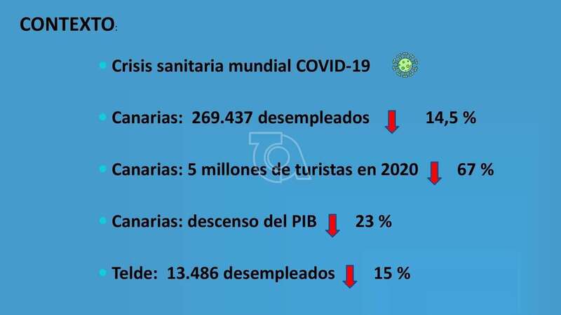 El alcalde inició la comparecencia poniendo de manifiesto las graves consecuencias sanitarias, económicas y sociales que ha producido la pandemia. Suárez arrojó datos en relación a la importante caída que sufrió el pasado 2020 el PIB en Canarias, un 23%, y las preocupantes cifras de desempleo que, en el caso de Telde, se sitúan en un total de 13.486 personas en paro.
