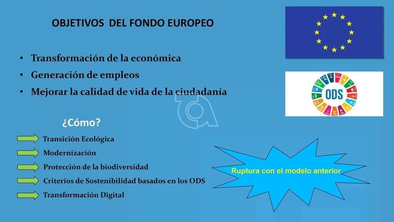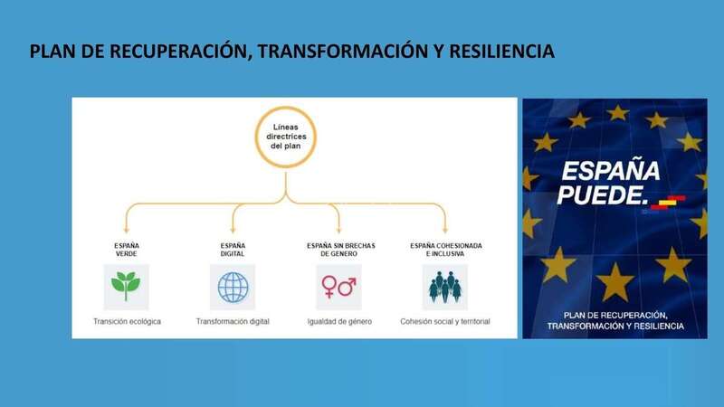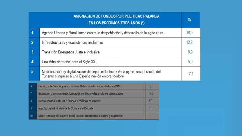 Monzón aclaró que el conjunto de propuestas se enmarca dentro de los cinco ejes establecidos y que son: Agenda urbana y rural contra la despoblación y desarrollo de la agricultura; Infraestructuras y ecosistemas resistentes; Transición energética justa e inclusiva; Una administración para el siglo XXI; Modernización y digitalización del tejido industrial y de la pyme, recuperación del turismo e impulso a la emprendiduría.