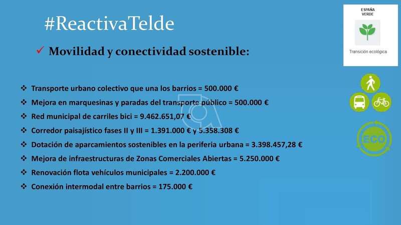 Hernández hizo hincapié en que entre las 125 iniciativas presentadas están implicadas las mayorías de las áreas que conforman el Gobierno municipal y subrayó algunas de las políticas palanca que se han priorizado: la lucha contra la brecha digital; la modernización de la industria en las micropymes y pymes, con el objetivo de atraer inversión y empleo; la mejora de las infraestructuras y su adecuación a sistemas de sostenibilidad; la mejora del transporte urbano colectivo, con la propuesta de una guagua eléctrica circular que dé respuesta los problemas de movilidad de un municipio tan disperso como Telde. "La ciudad ha sido y será ambiciosa en su propósito de formar parte de la Europa verde y digital", concluyó.