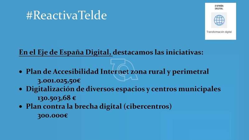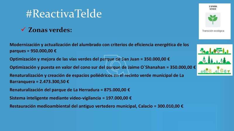 El edil de Medioambiente, Álvaro Monzón, fue el encargado de exponer algunas de las 125 iniciativas que se han recogido bajo el nombre #ReactivaTelde y que ya han sido registradas en la plataforma habilitada por el Gobierno de Canarias para optar a los primeros 630 millones de euros del Fondo con lo que contará Canarias.
