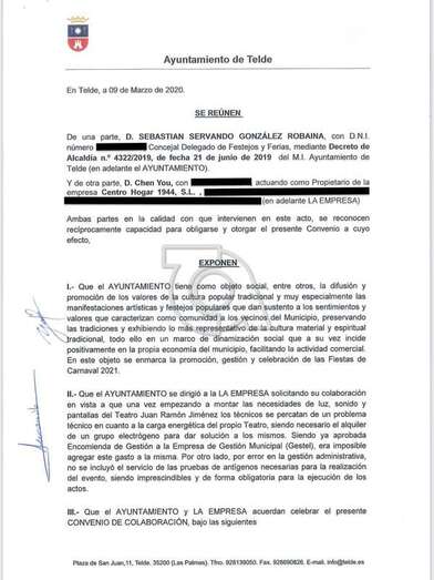 Ciuca subrayó que “el convenio está firmado por Servando González, concejal de Festejos, y por un empresario chino, con negocios en el municipio, dónde se le indica que tiene que pagar dos facturas, señaladas por el propio edil, para la celebración de la gala privada del carnaval que tuvo lugar en el Teatro Juan Ramón Jiménez”.