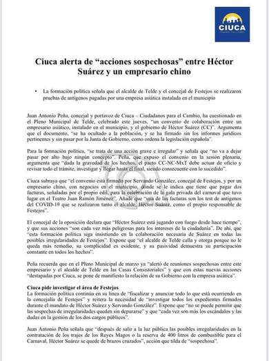 Peña recordoó que en el Pleno municipal de marzo ya “alertó de reuniones sospechosas entre este empresario y el alcalde de Telde en las Casas Consistoriales” y que con estas nuevas acciones “destapadas por Ciuca, se pone de manifiesto la relación de su Gobierno con la empresa asiática”.