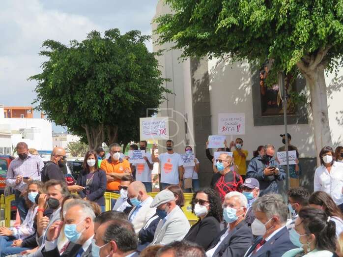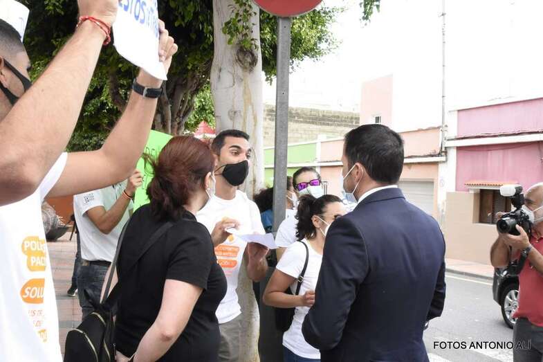Suárez y Hernández se acercaron este mediodía a hablar con los trabajadores afectados que llevaban a cabo una protesta silenciosa en El Calero con motivo del acto de inauguración de la escultura homenaje a los sanitarios, tal y como adelantó TELDEACTUALIDAD.