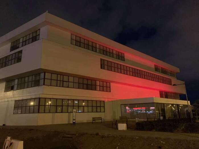 Iluminación de rojo de la fachada del edificio administrativo de El Cubillo/TA. Iluminación de rojo de la fachada del edificio administrativo de El Cubillo/TA.