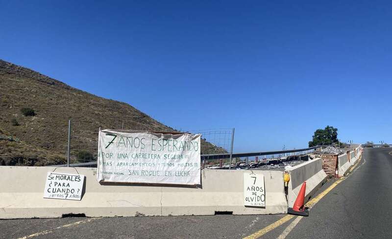 Telde.- Vecinos de San Roque han desplegado pancartas en la carretera que une Telde con Valsequillo a través de La Higuera Canaria, la GC-810, para exigir la reparación de un muro de contención que se cayó en 2014 en territorio del municipio teldense.