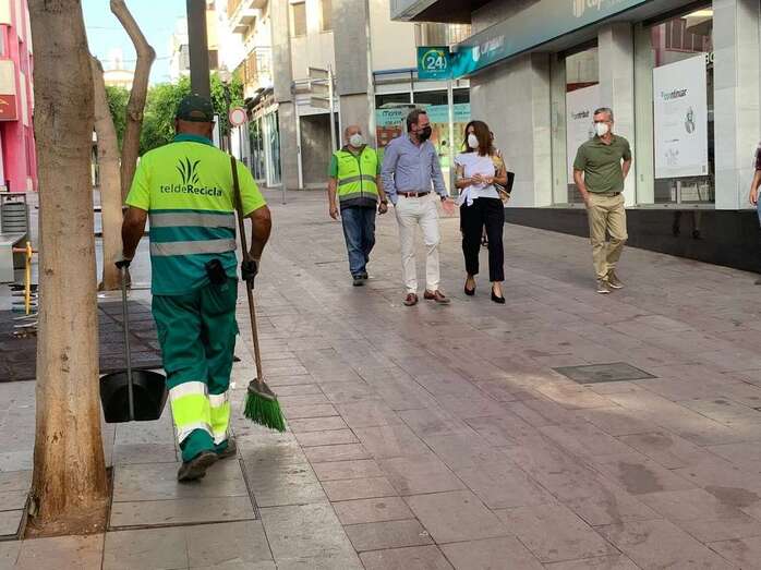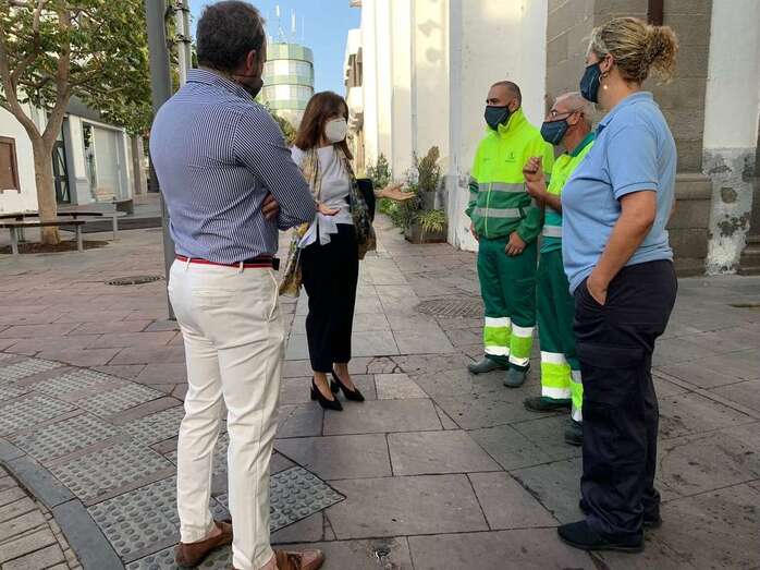 La alcaldesa, Carmen Hernández, y el concejal de Limpieza, Eloy Santana, recorrieron este espacio del casco de Telde para conocer los trabajos que se estaban ejecutando e intercambiar con responsables de la empresa impresiones, con el fin de mejorar el servicio que se ofrece a la ciudadanía.