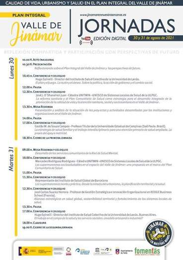 El equipo comunitario del Plan Integral del Valle de Jinámar completa el marco con un análisis de la situación de los proyectos y actividades desarrolladas por las instituciones y organizaciones en el Valle de Jinámar. La serie de conferencias está circunscrita en el marco de la Agenda 2030 y la consecución de los Objetivos de Desarrollo Sostenible (ODS). Impulsan las jornadas el Ministerio de Derechos Sociales y Agenda 2030 del Gobierno de España, el Ayuntamiento de Telde, la Cátedra UNITWIN –UNESCO de Investigación, Planificación y Desarrollo de Sistemas Locales de Salud de la ULPGC y Fomentas (Empresa Municipal de Vivienda y Suelo de Telde).