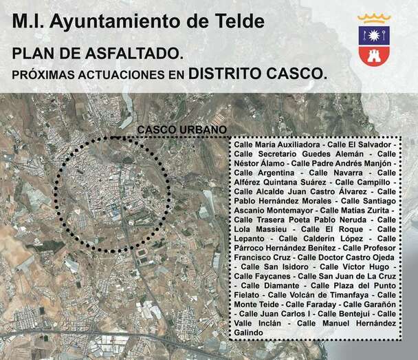 Posteriormente, a partir del 10 de enero se procederá a reasfaltar el resto de las calles incluidas en este proyecto: María Auxiliadora, El Salvador, Secretario Guedes Alemán, Néstor Álamo, Padre Andrés Manjón, Argentina, Navarra, Alférez Quintana Suárez, Campillo, Alcalde Juan Castro Álvarez, Pablo Hernández Morales, Santiago Ascanio Montemayor, Matías Zurita, Trasera Poeta Pablo Neruda, Lola Massieu, El Roque, Lepanto, Calderín López, Párroco Hernández Benítez, Profesor Francisco Cruz, Doctor Castro Ojeda, Faycanes, San Juan de la Cruz, Diamante, Plaza del Punto Fielato, Volcán de Timanfaya, Monte Teide, Faraday y Garañón.